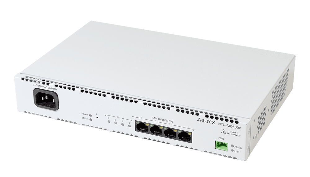 NTU-MD500P — оптические сетевые терминалы, которые имеют 4 порта 10/100/1000BASE-T с под-держкой стандарта IEEE 802.3at PoE+. Терминалы NTU-MD500P обеспечивают мощность до 30 Вт на портах 10/100/1000BASE-T с бюджетом мощности PoE — 65 Вт.