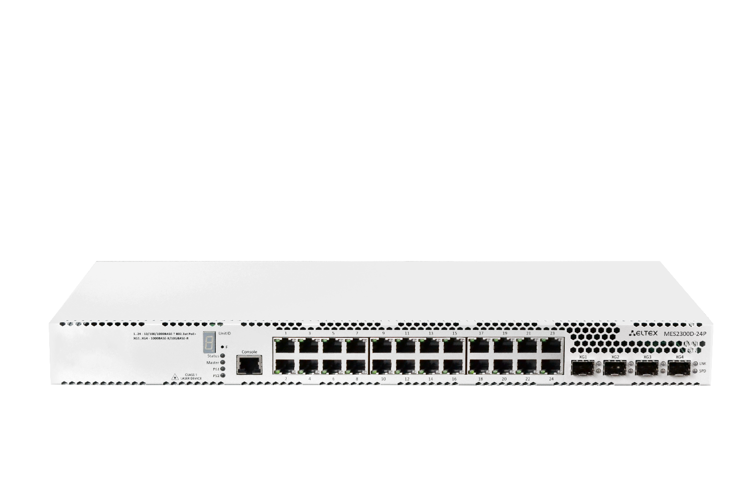 Коммутаторы MES2300D-24P с поддержкой PoE осуществляют подключение конечных пользователей к сети крупных предприятий, предприятий малого и среднего бизнеса и к сетям операторов связи с помощью интерфейсов 1G/10G.