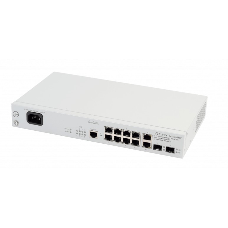 MES2308P - управляемый стекируемый коммутатор уровня L2+ с 10 портами 10/100/1000BASE-T (RJ-45). 8 портов PoE/PoE+ и 2 порта 1000BASE-X (SFP). Ethernet-коммутатор подключает конечных пользователей к сети крупных предприятий, предприятий малого и среднего бизнеса и к сетям операторов связи с помощью интерфейсов Gigabit Ethernet.